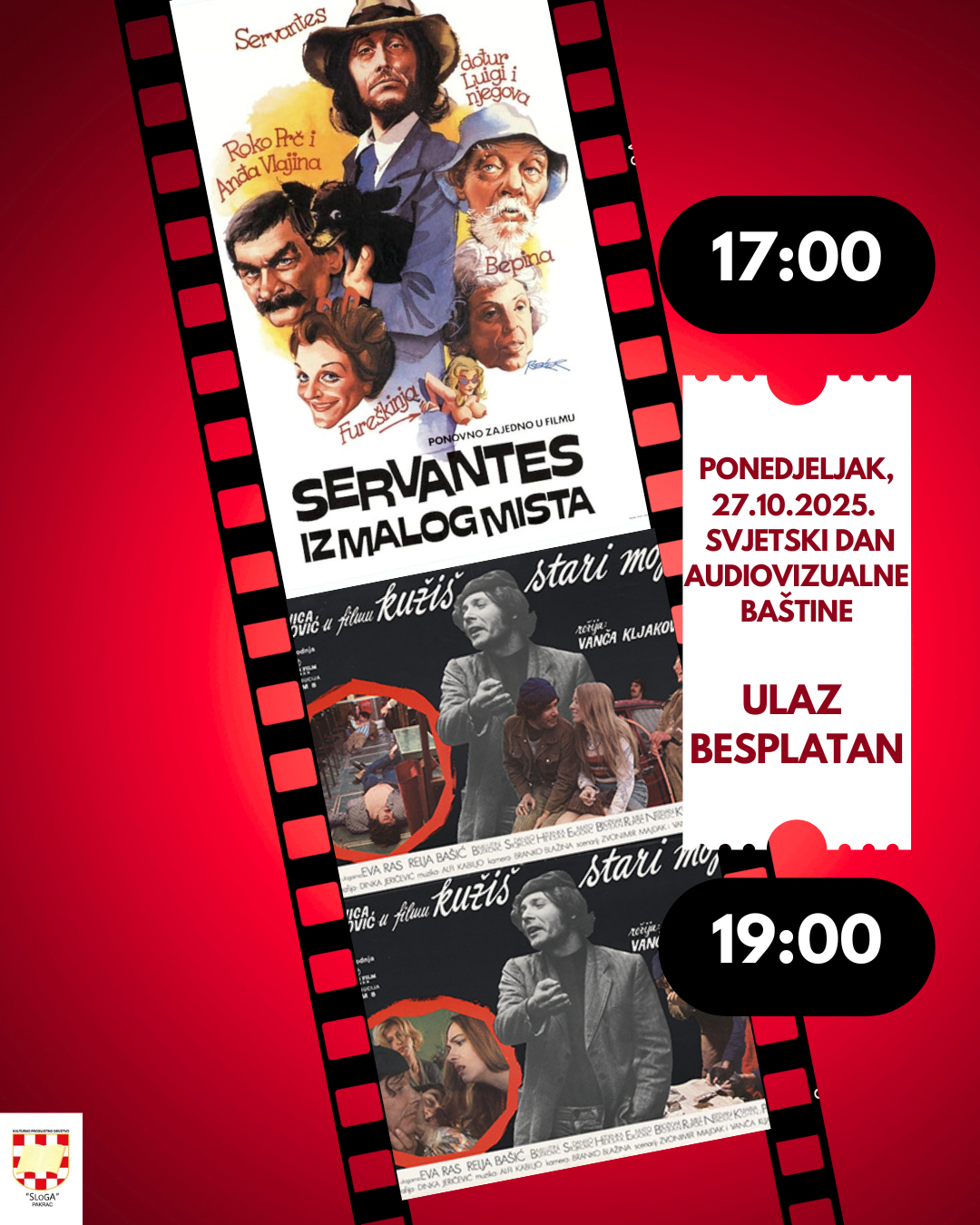 U ponedjeljak, 27.10., povodom obilježavanja Svjetskog dana audiovizualne baštine, u našem kinu besplatno pogledajte projekcije poznatih hrvatskih filmova.