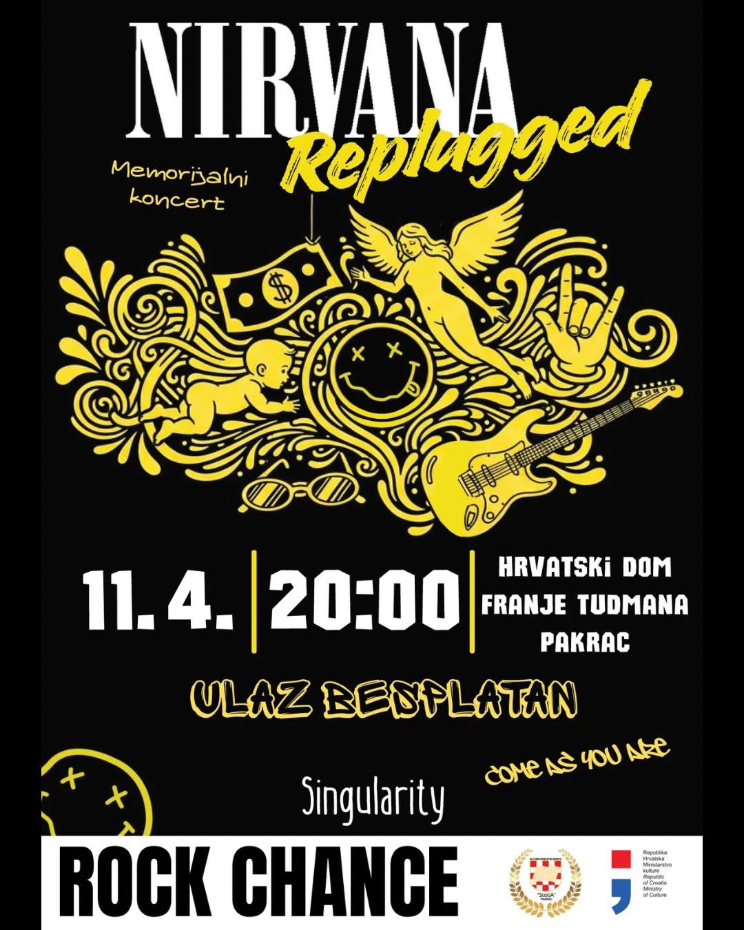 U drugoj glazbenoj večeri projekta “Rock chance”, sufinanciranog sredstvima Ministarstva kulture i medija RH, dočekat ćemo vas u našoj velikoj (kino) dvorani pjesmom COME AS YOU ARE Kurta Cobaina/Nirvana, te nastaviti koncertom iste Nirvane. Večer je to posvećena velikom glazbeniku i njegovom bendu koji je stvarao nevjerojatne rock skladbe, inspirirao generacije, stvorio grunge.